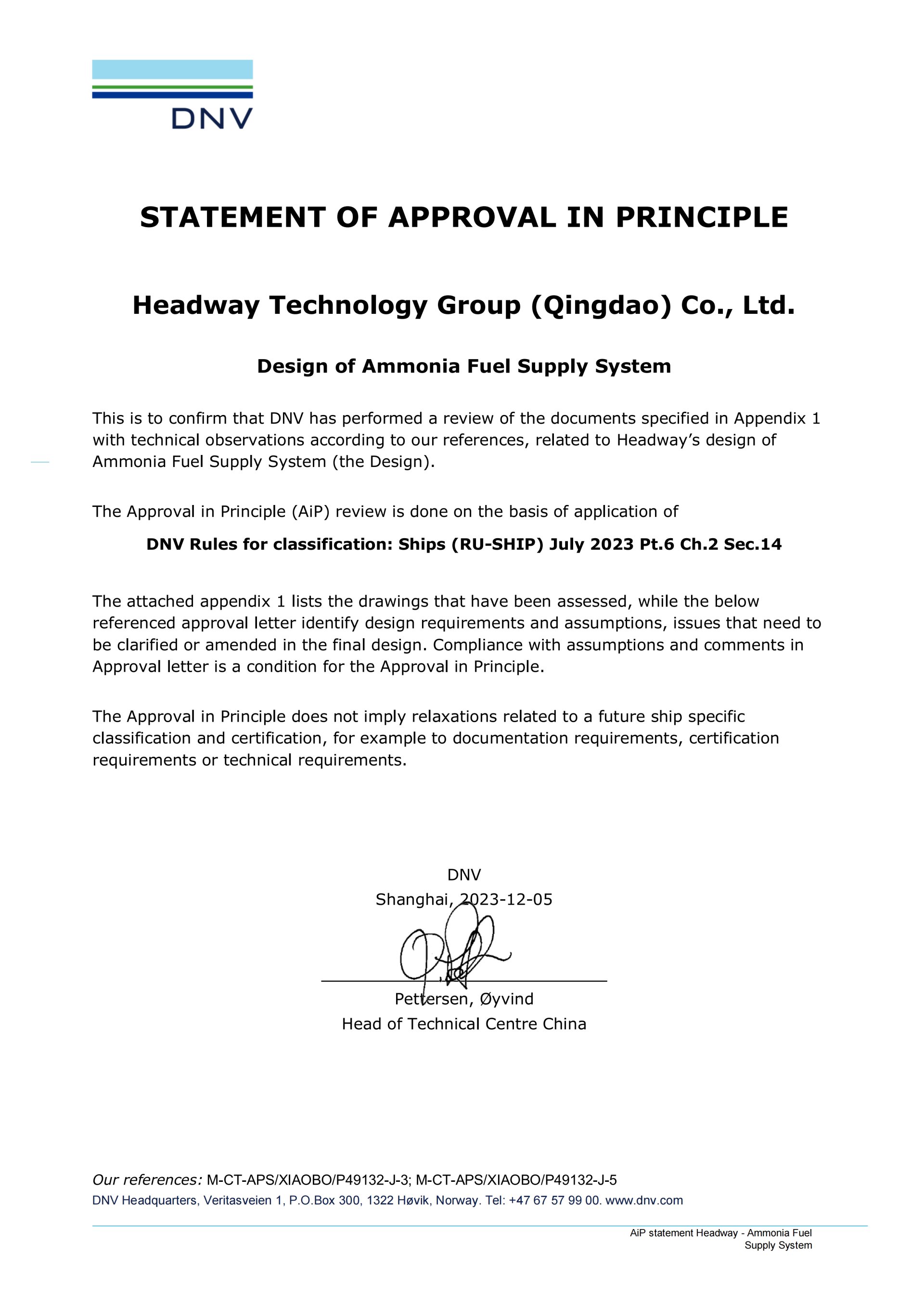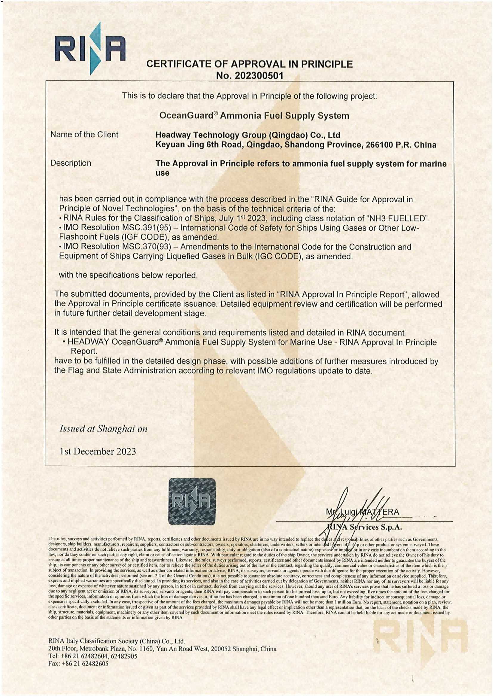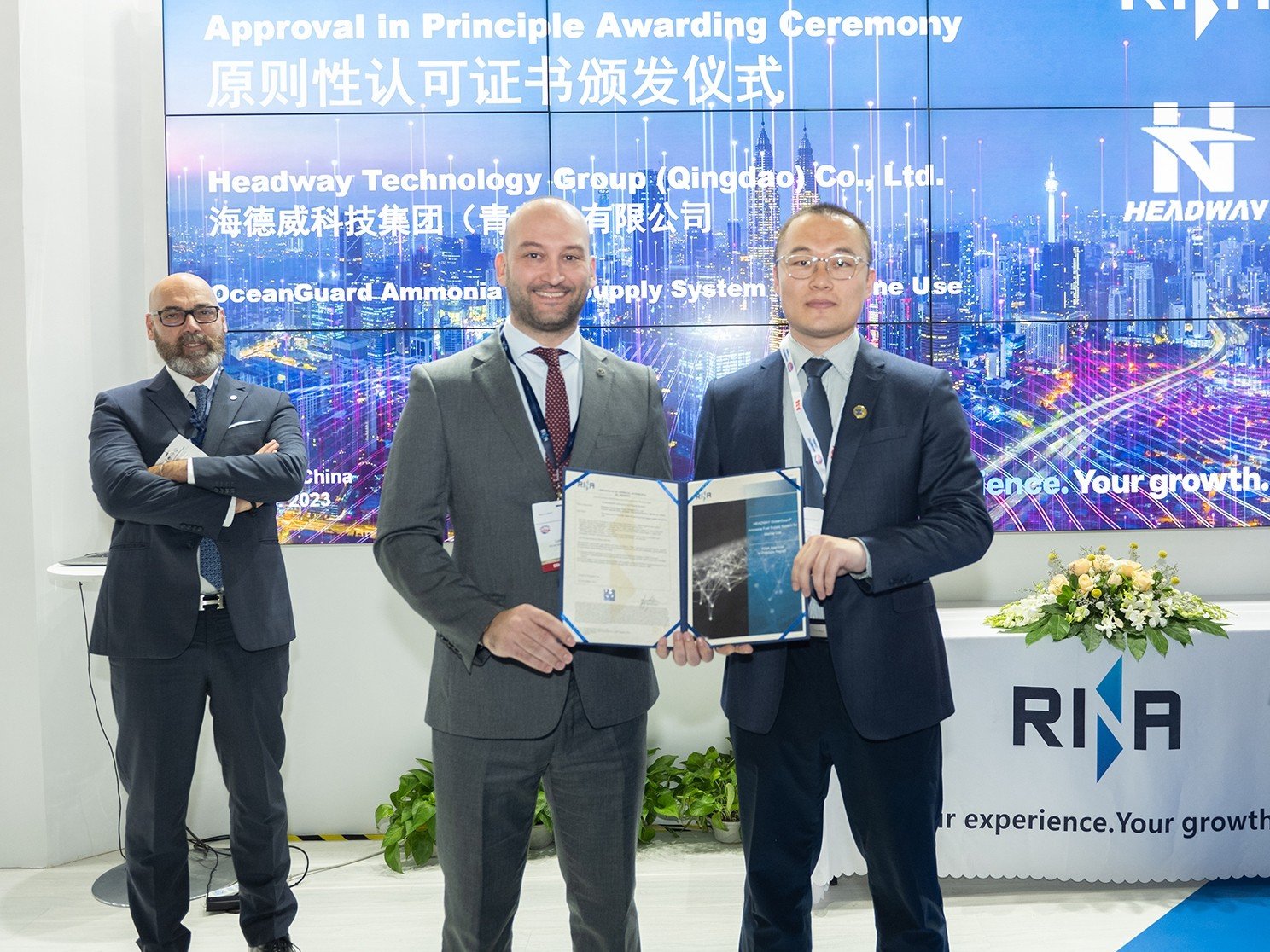 2023年中國(guó)國(guó)際海事會(huì)展上,海洋衛(wèi)士?氨燃料供給系統(tǒng)正式取得DNV船級(jí)社和RINA船級(jí)社授予的原理認(rèn)可證書(shū),標(biāo)志著海德威低碳航運(yùn)產(chǎn)品生態(tài)再度擴(kuò)軍并取得業(yè)界權(quán)威認(rèn)可。